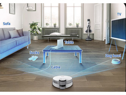 Samsung Jet Bot AI+ VR50T95735W est un aspirateur robot intelligent doté d'une navigation avancée et d'une caméra intégrée pour éviter les obstacles.