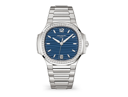 The Nautilus ladies' automatic in steel with a diamond-set bezel accentuates its presence on the wrist with a slightly larger diameter (35.2 mm instead of 33.6 mm).