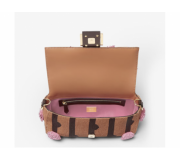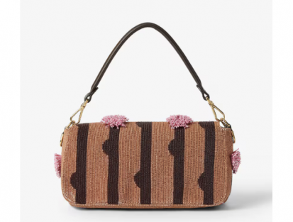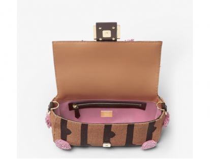 Fully hand-embroidered with over 130,000 beads in brown and black forming the FF-Dots pattern, it features pink three-dimensional bead tassels and gold-tone hardware.