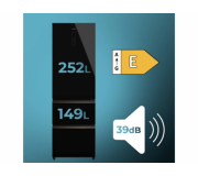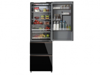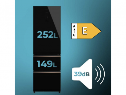Its sleek black glass finish, compact 60 cm width and 63.8 cm depth, bottom freezer, and energy rating E deliver balanced performance with efficient interior lighting for easy daily use and organization.