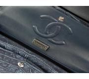 The Chanel Navy Blue Double Flap Bag features a spacious interior with two pockets and a leather-and-chain strap that can be worn as a shoulder bag or crossbody.