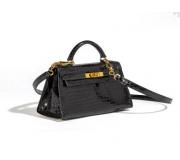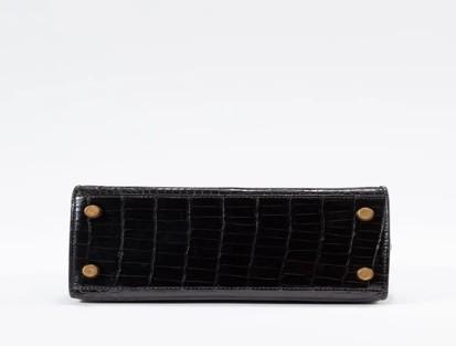 Experience timeless luxury with the Hermes Vintage Mini Kelly 20 Sellier in glossy black crocodile leather, finished with gleaming gold-tone hardware.